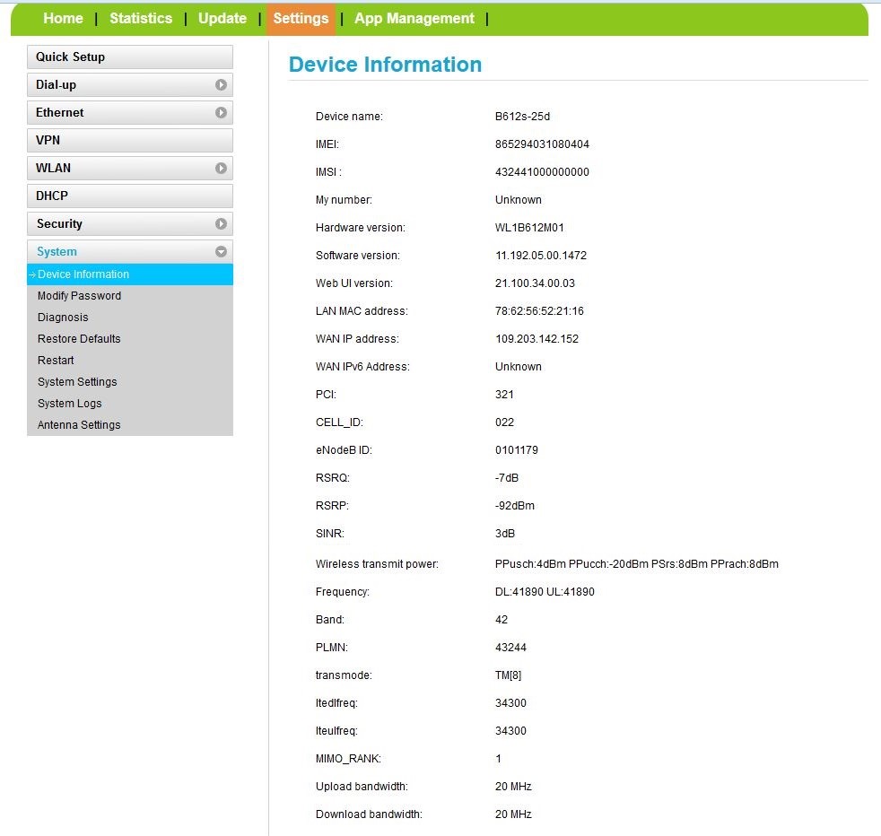 این بخش شامل پارامترهای دریافت سیگنال، مشخصات مودم شامل نام، ورژن و سایر موارد مربوطه میشود. برای مشاهده جزییات، تصویر زیر را مشاهده کنید.