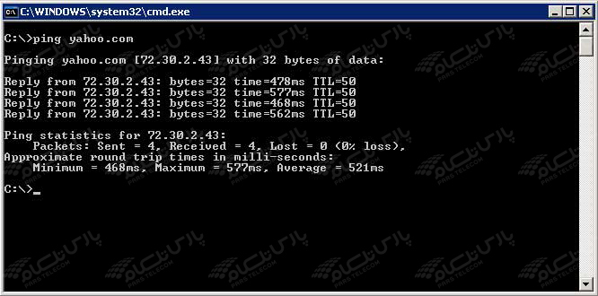 در صورت داشتن Reply از Valid IP، میتوان نتیجه گرفت که ارتباط شما با اینترنت برقرار و کانفیگ مودم شما به صورت صحیح انجام شده است. (دقت کنید که در انتهای هر Reply، Time و TTL وجود داشته باشد.) در مرحله بعد دستور Ping yahoo.com را اجرا و سایت Yahoo را Ping میکنیم.