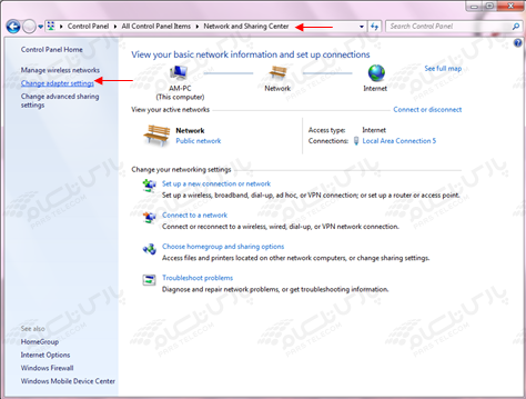 با انتخاب گزینه View network status and tasks و یا Network and Sharing Center پنجره شکل زیر نمایش داده خواهد شد: