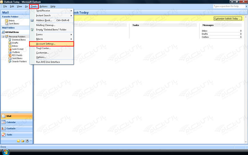 در ابتدا میبایست به این نکته توجه فرمایید که این تنظیمات باید به صورت موقت بر روی Outlook شما انجام شود و شما میبایست با تماس با هاست خود و درخواست باز کردن پورت ۵۸۷ توسط هاست تنظیمات آنها را با در نظر گرفتن پورت ۵۸۷ انجام دهید چرا که بهتر است که ارسال ایمیل از هاست خودتان انجام شود. در صورت عدم توانایی بر باز کردن پورت ۵۸۷ بر روی هاست برای اعمال تغییرات به صورت زیر عمل کنید: ابتدا مانند شکل زیر از منوی Tools، گزینه Account Settings را انتخاب کنید.